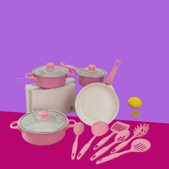 Dale un toque único y moderno a tu cocina con este hermoso set de 13 piezas, que combina ollas de alta calidad con utensilios esenciales para cocinar todo tipo de recetas. Su espectacular color rosado lo hace ideal para quienes aman una cocina elegante, organizada y llena de estilo.